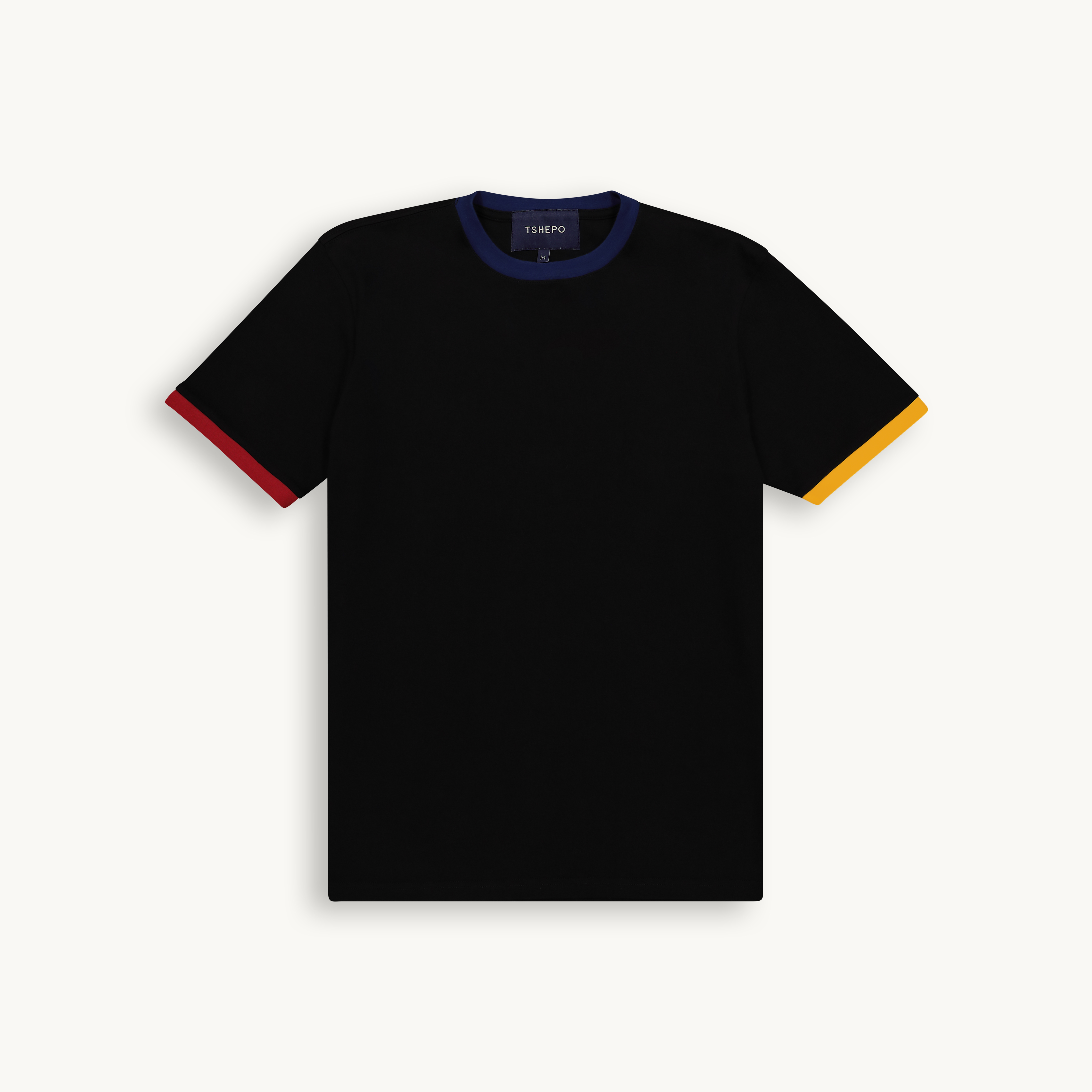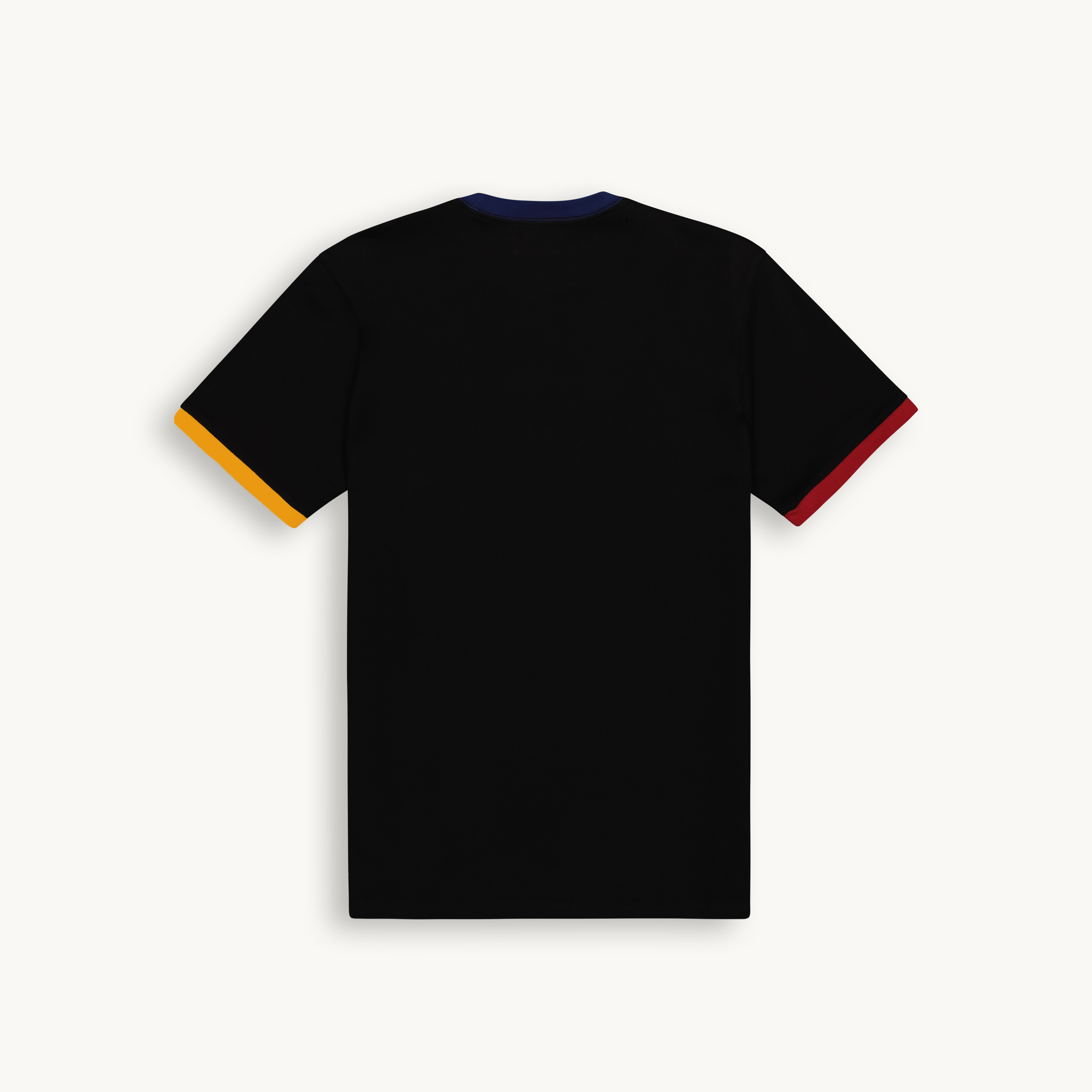 Simple doesn’t have to mean serious. This tee keeps the body clean while letting the flag colours play out in the ribbing, at the collar and sleeves. Also available in White.