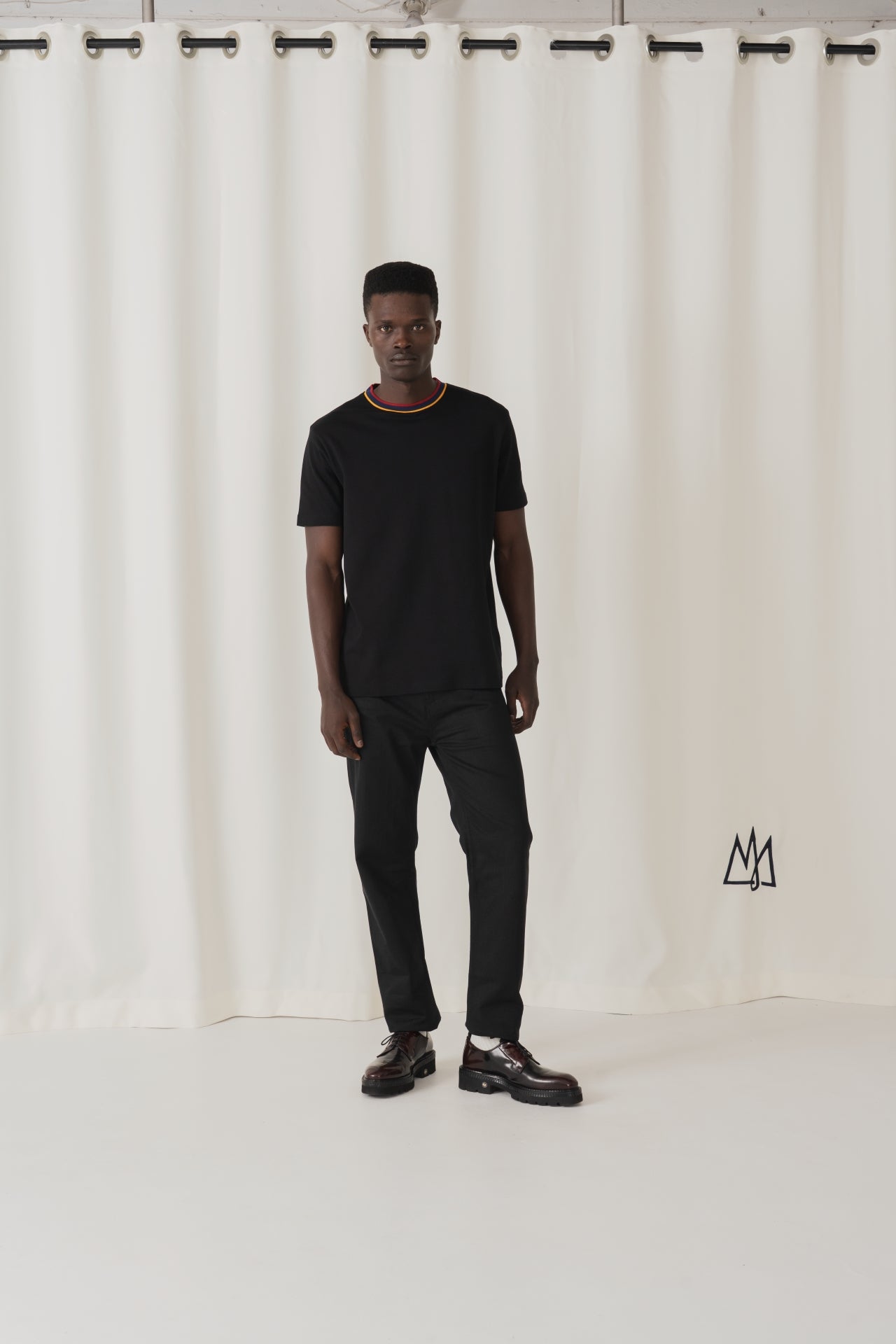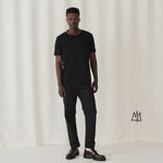Your go-to plain black and white tee, but with an edge. The ribbed neckline in TSHEPO’s flag colours adds a subtle mark of pride to an everyday staple.
