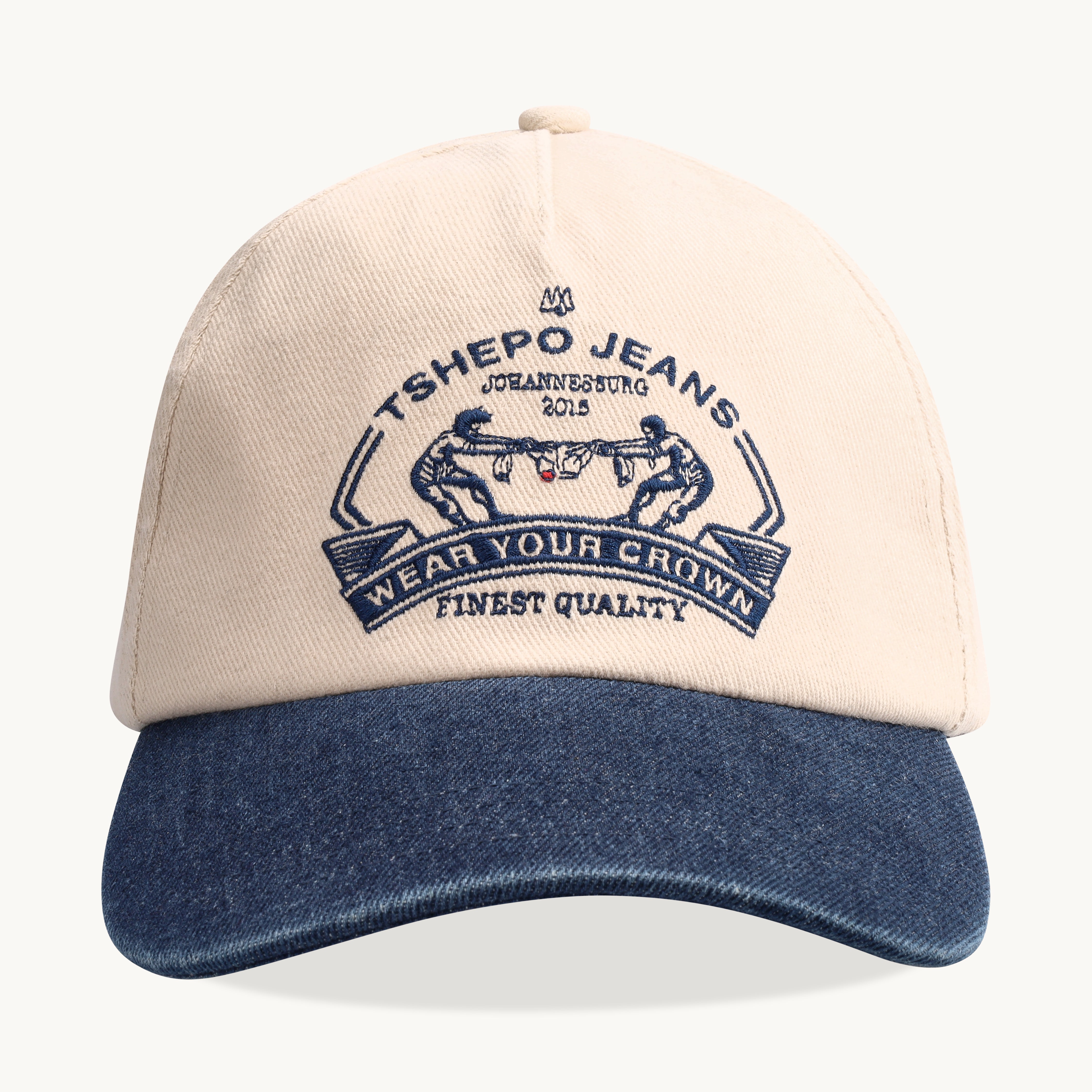This cap draws from Musangwe, Venda’s traditional bare-knuckle wrestling, where the finest fighters battle for pride and honour. Here, they wrestle over denim itself, because even the strongest can’t break the finest quality jeans. With a crisp white crown and a denim blue peak, it’s a head-turning tribute to TSHEPO’s unshakable craftsmanship.