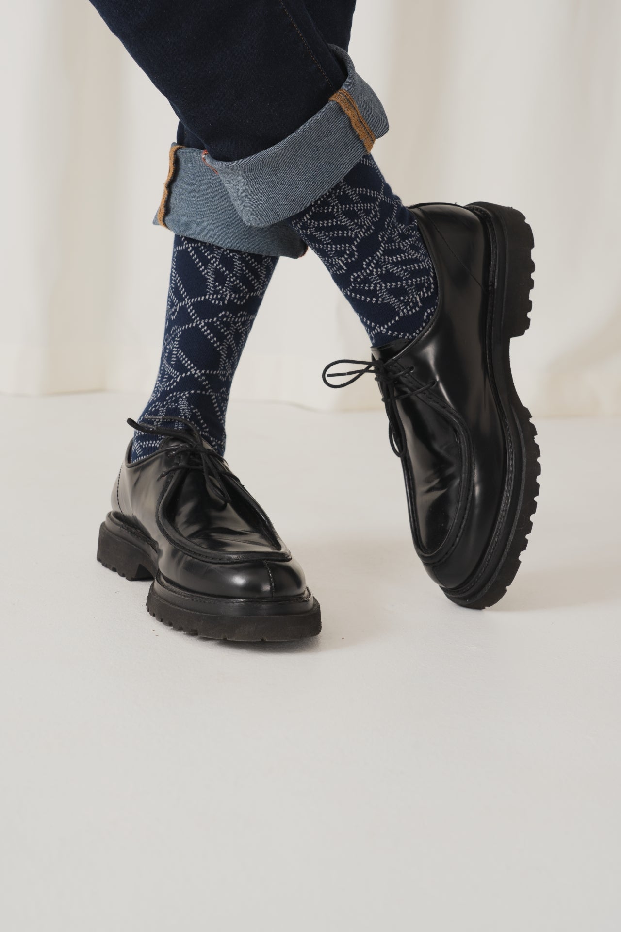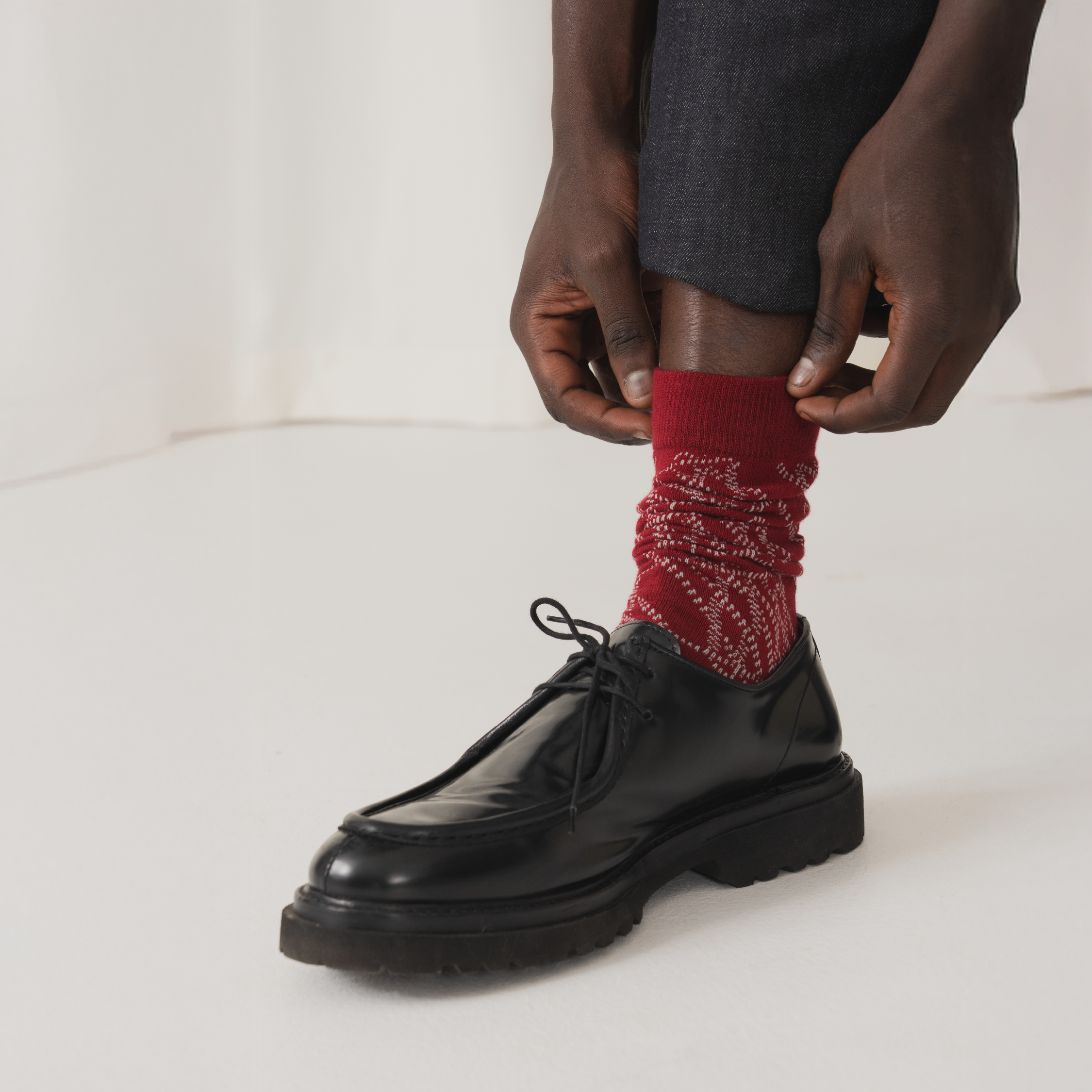 These cotton-rich socks carry the TSHEPO monogram in repeating pattern — a bold detail that turns a staple into a statement. Available in red or blue, they’re a small way to wear your crown with pride.