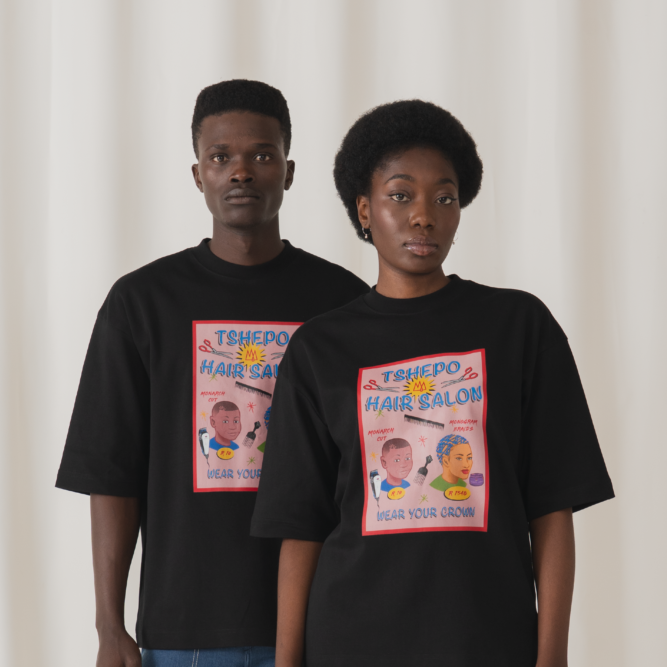 This black tee draws from the bold boards of South African barbershops, celebrating hair, pride, and identity. The design stands loud on the front, with a subtle nod to hair-itage on the back.