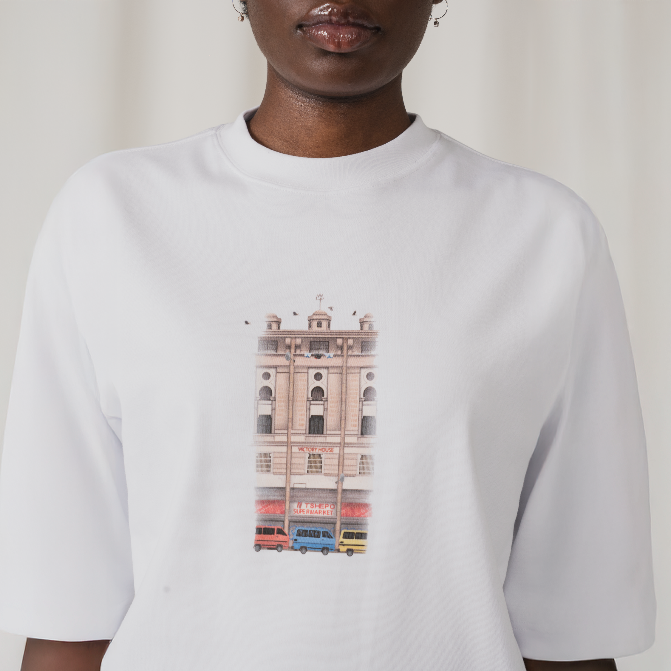 Built in 1897 as Johannesburg’s first lift building, Victory House is the oldest survivor of Marshallstown’s 1886 grid, a landmark with a legacy as enduring as the city itself. This tee honours that heritage in a Jozi scene alive with taxis in TSHEPO’s flag colours and hadedas overhead.