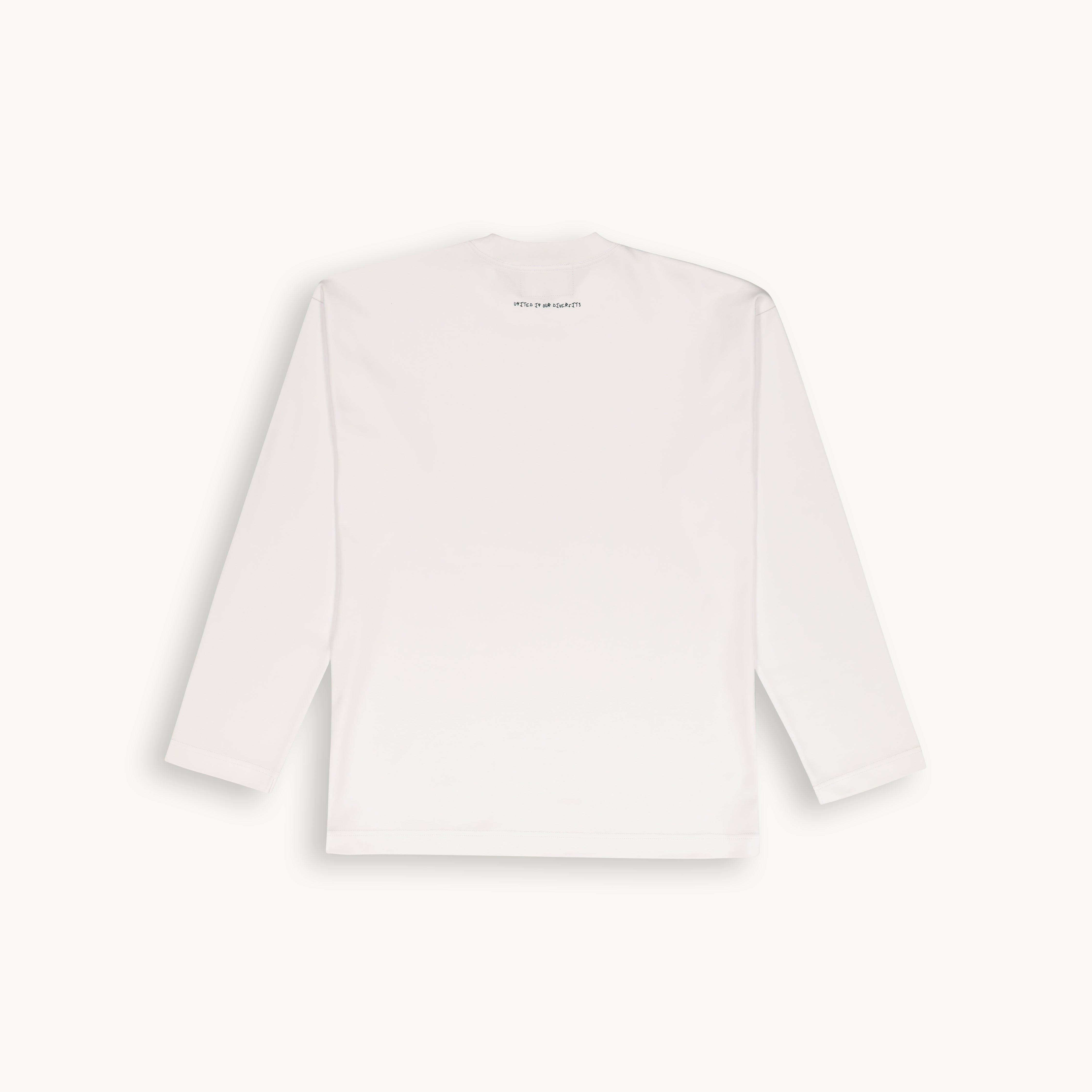 Set in bold contrast and cut oversized, this long sleeve wears the statement without ever softening it. Also available in Black with White print.